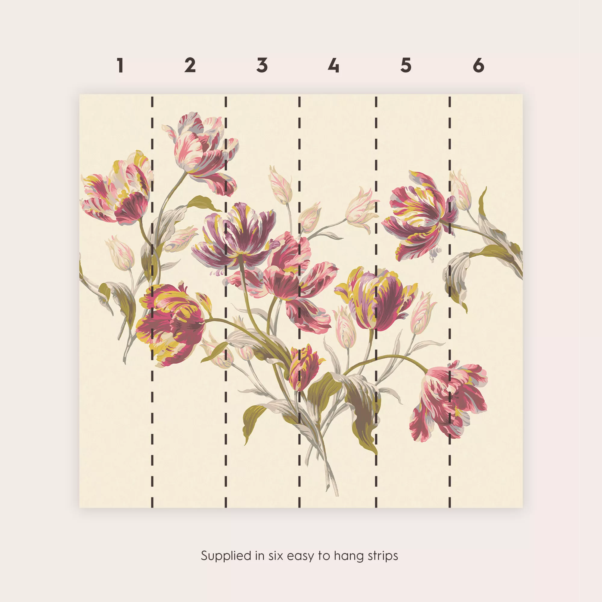 A classic Laura Ashley design, featuring gorgeous bold tulips in cranberry hues, blown up to mural size to create a beautiful centre piece. Our murals come on one roll with 6 referenced panels.
