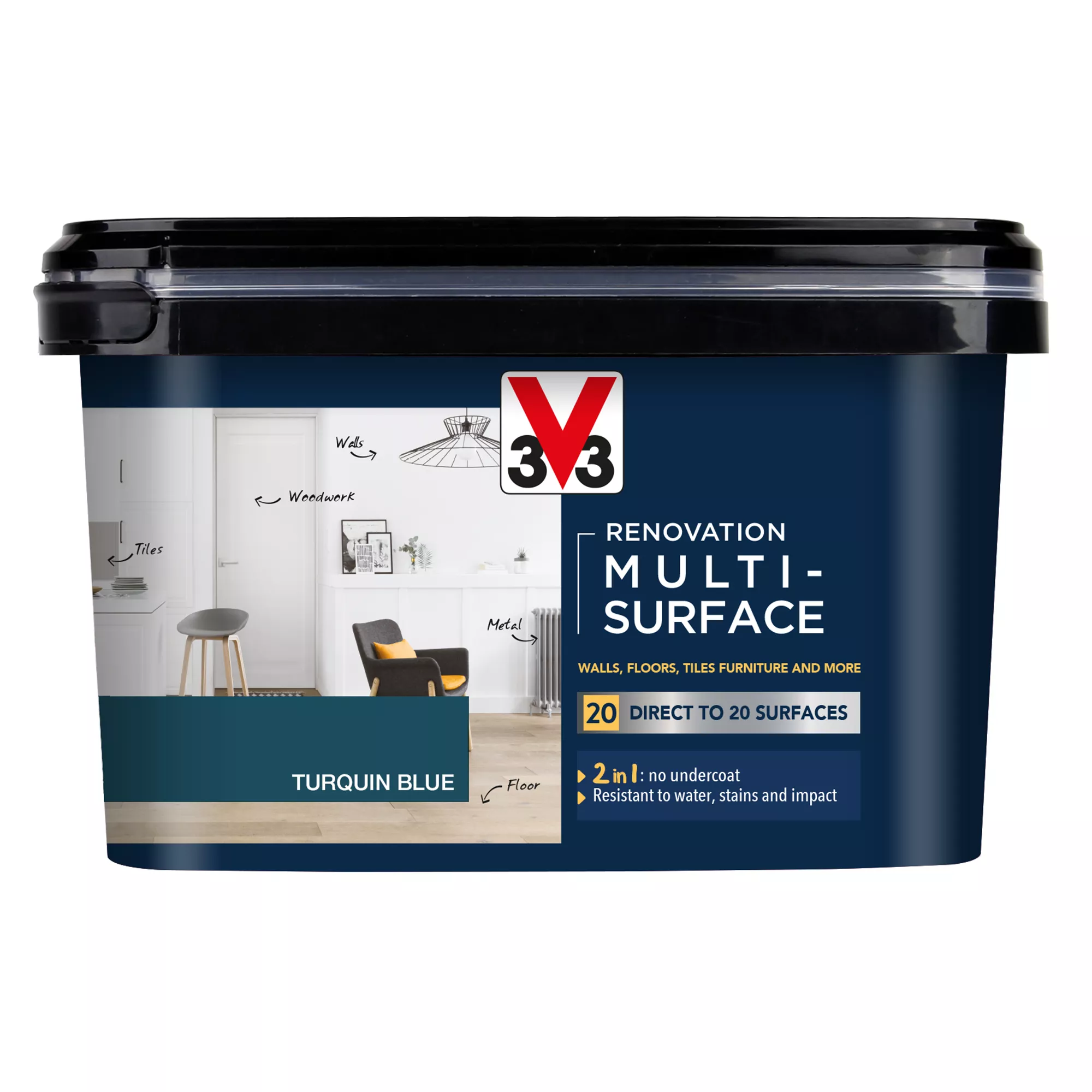 - V33 Renovation Multisurface Paint is a great solution when tackling multiple projects. Easy to apply, with a high coverage and perfect finish on 20 different surfaces including wood, tiles and metal. It allows you to transform your living spaces with a range of vibrant colours.